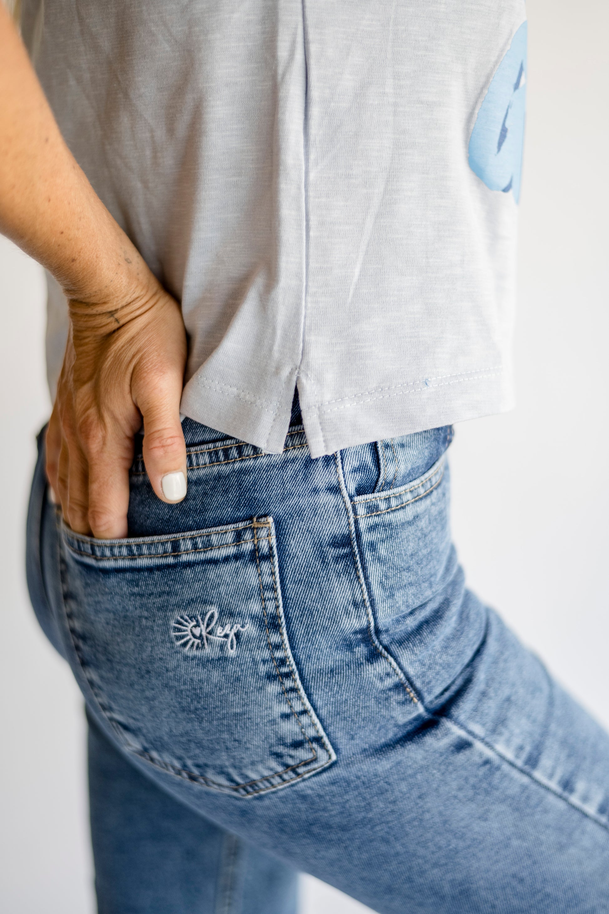 Un básico atemporal que no puede faltar en tu clóset. Nuestro Jeans Crop Azul tiene un calce recto desde la cadera hasta arriba del tobillo, logrando una silueta favorecedora y cómoda.