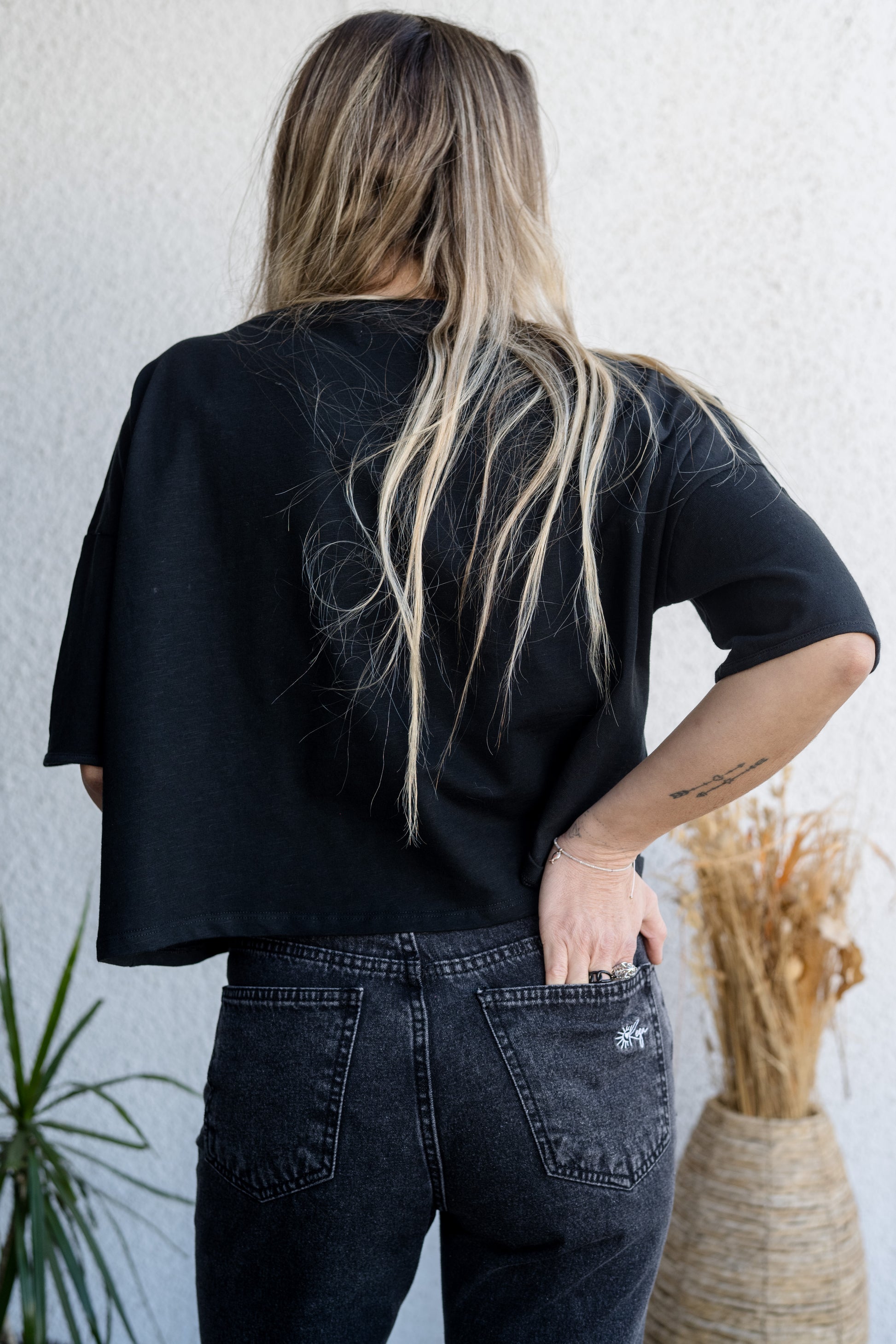 Una prenda con actitud y estilo. Esta polera negra de calce oversize y relajado combina un diseño de inspiración tropical con ilustraciones de tigres y palmeras. Confeccionada en un algodón suave y liviano que te asegura comodidad todo el día. Ideal para elevar un look casual con un toque salvaje y femenino.