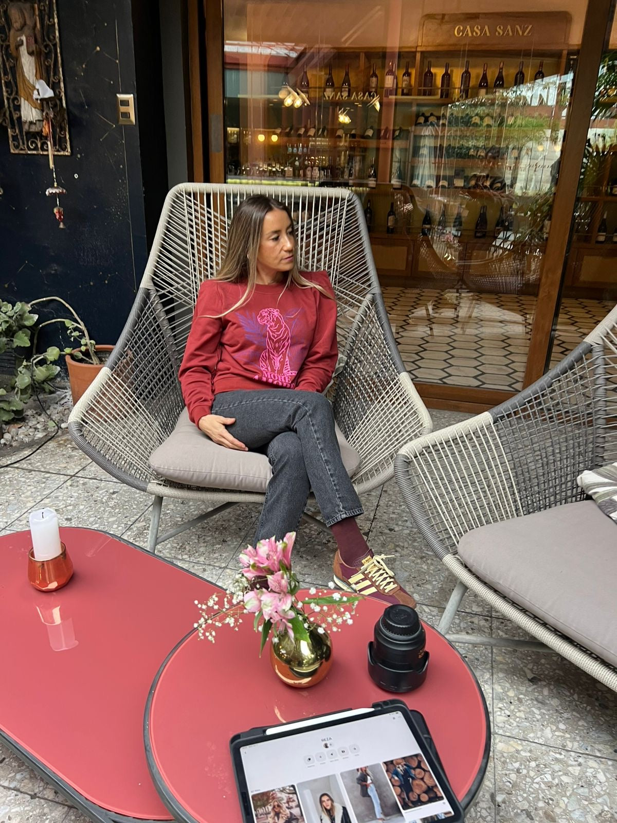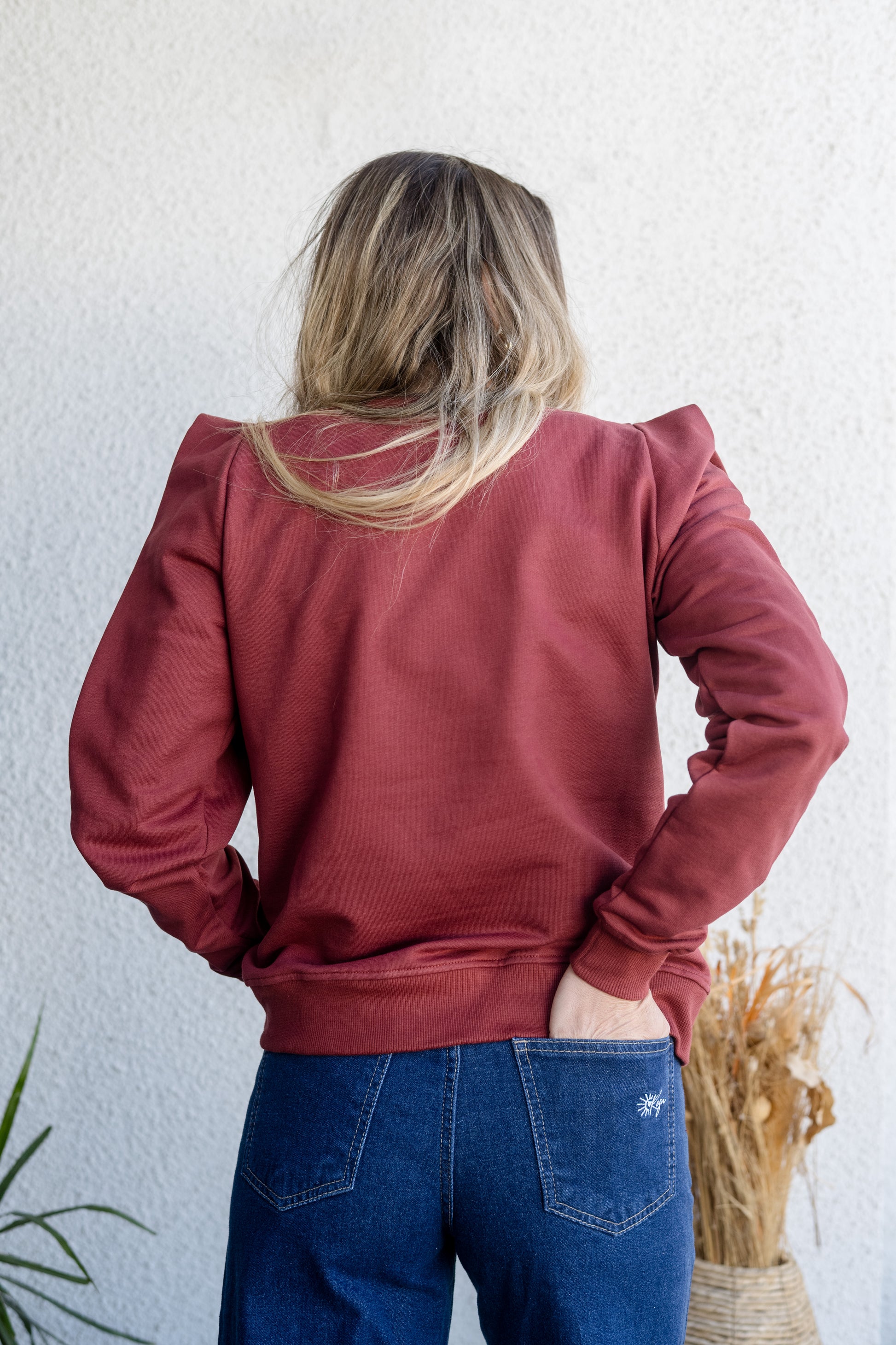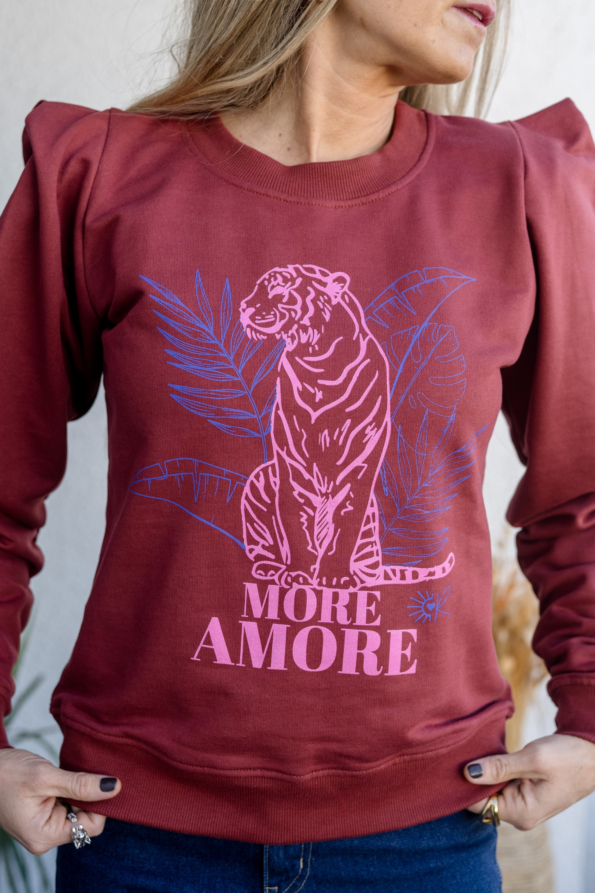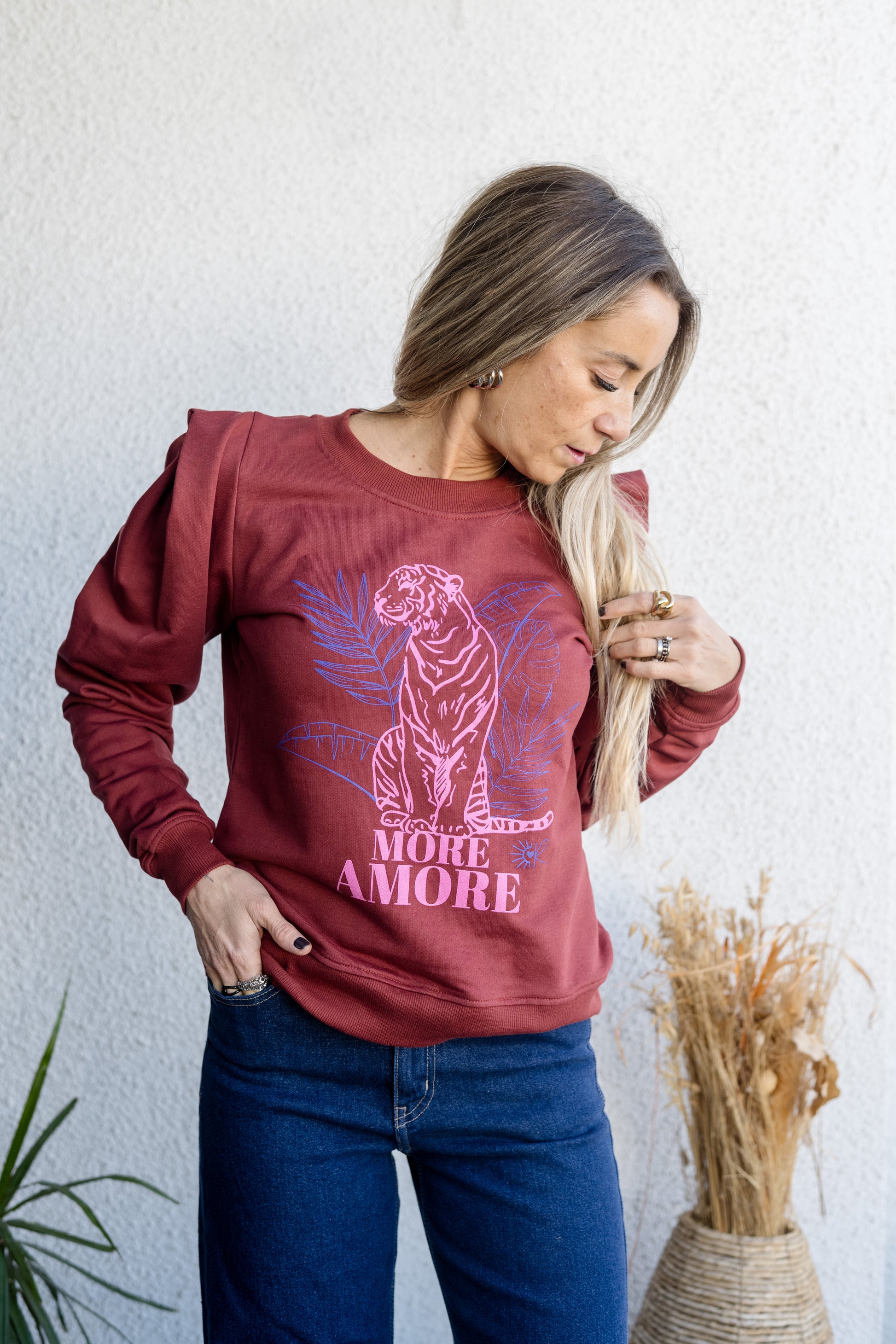 Polerón terracota con estampado frontal de tigre en tonos fucsia y morado. Tiene un diseño único con hombros tipo princesa que aporta un toque femenino y estilizado. Ideal para usar con jeans o pantalones relajados. Su calce cómodo y suave al tacto lo convierte en una prenda clave para tu clóset.